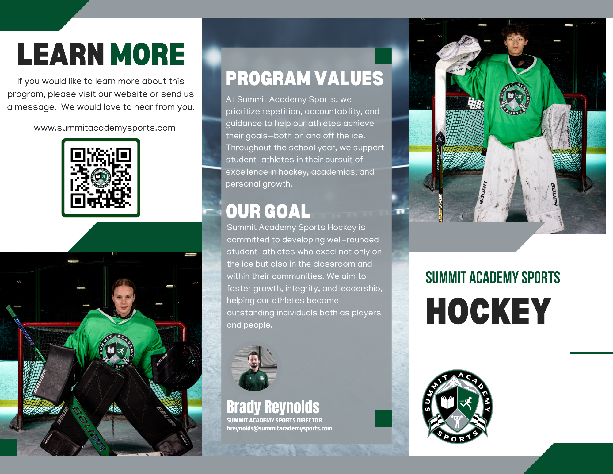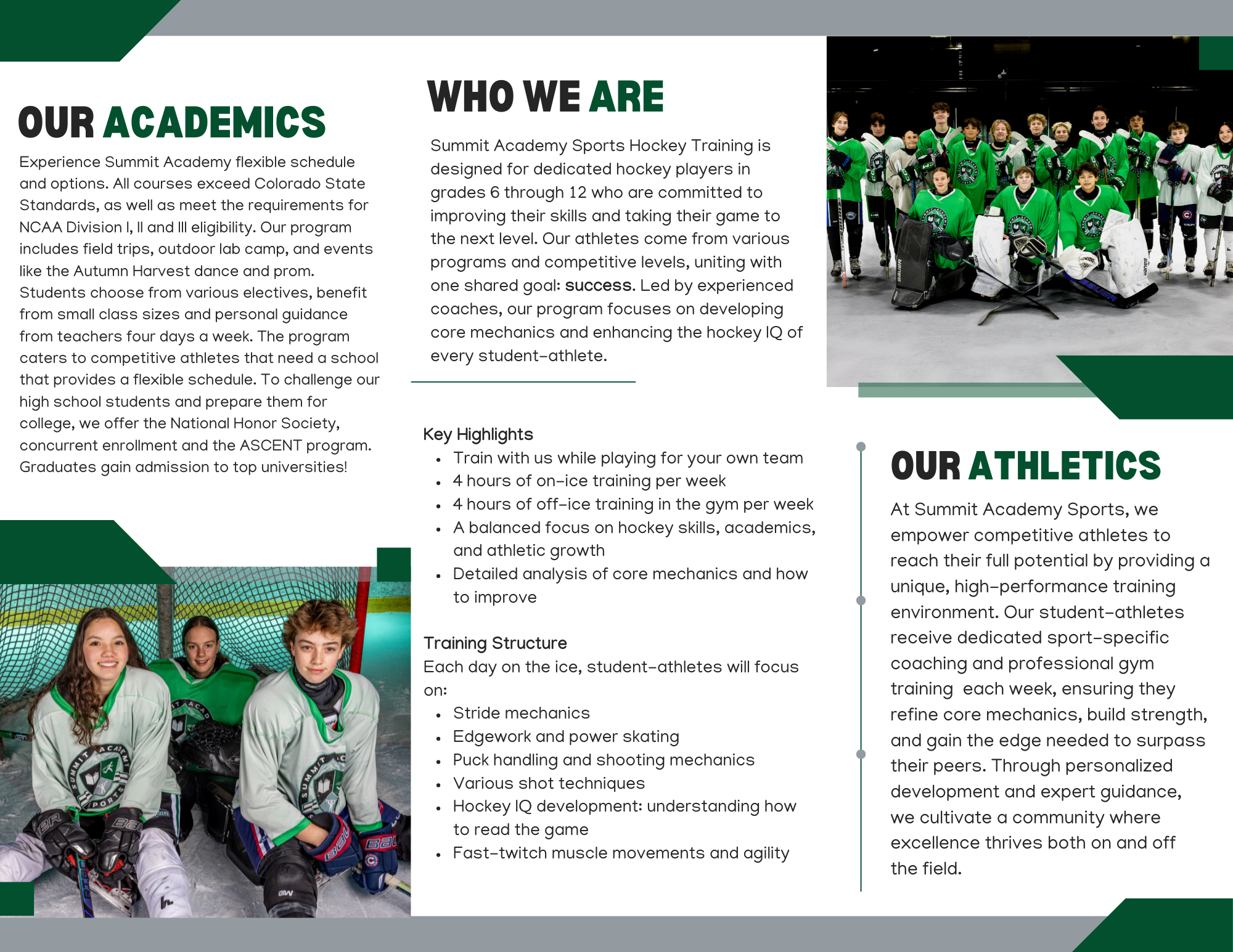The Summit Academy Sports Hockey program offers innovative training and a specific curriculum for player development, focusing on personal growth on and off the ice.