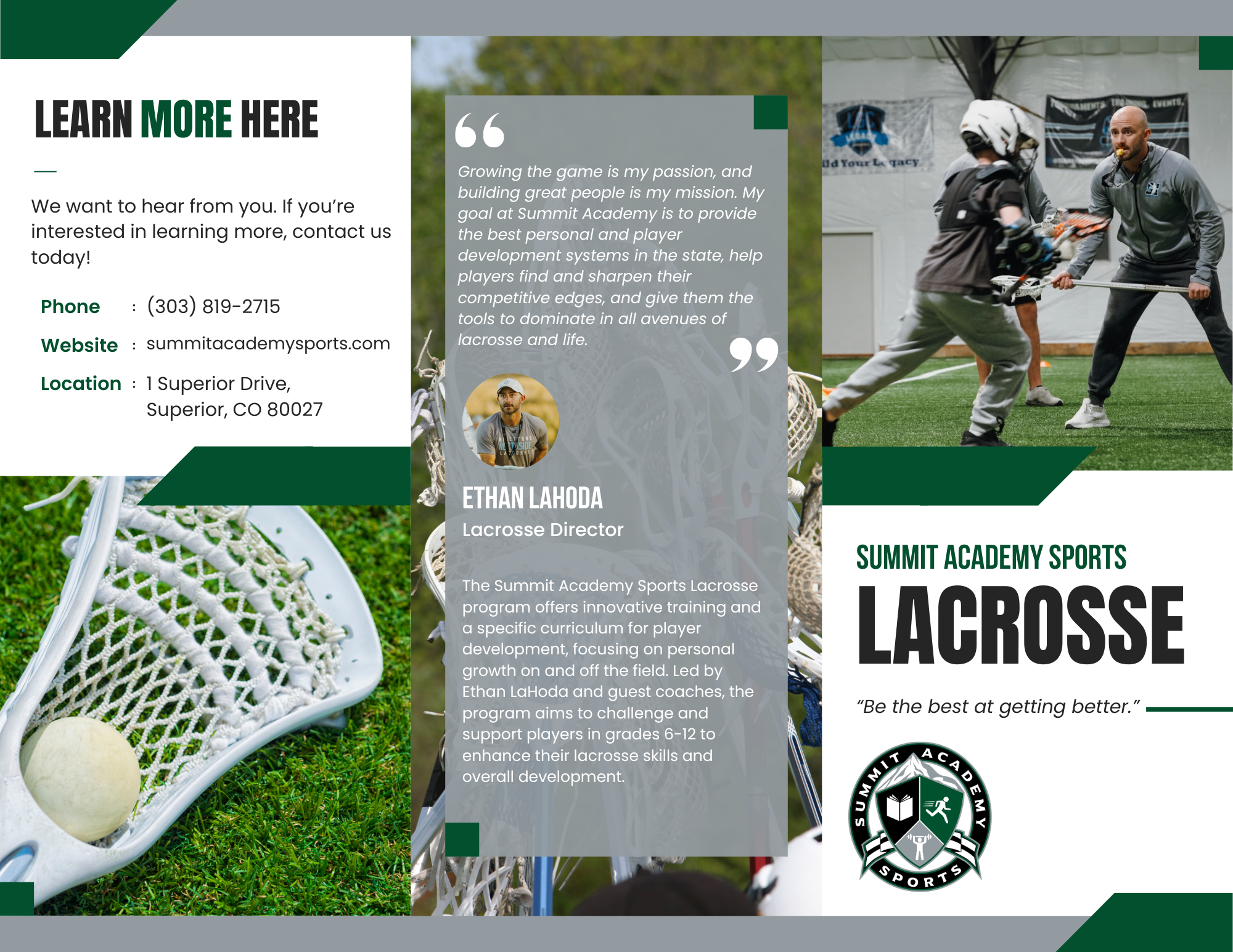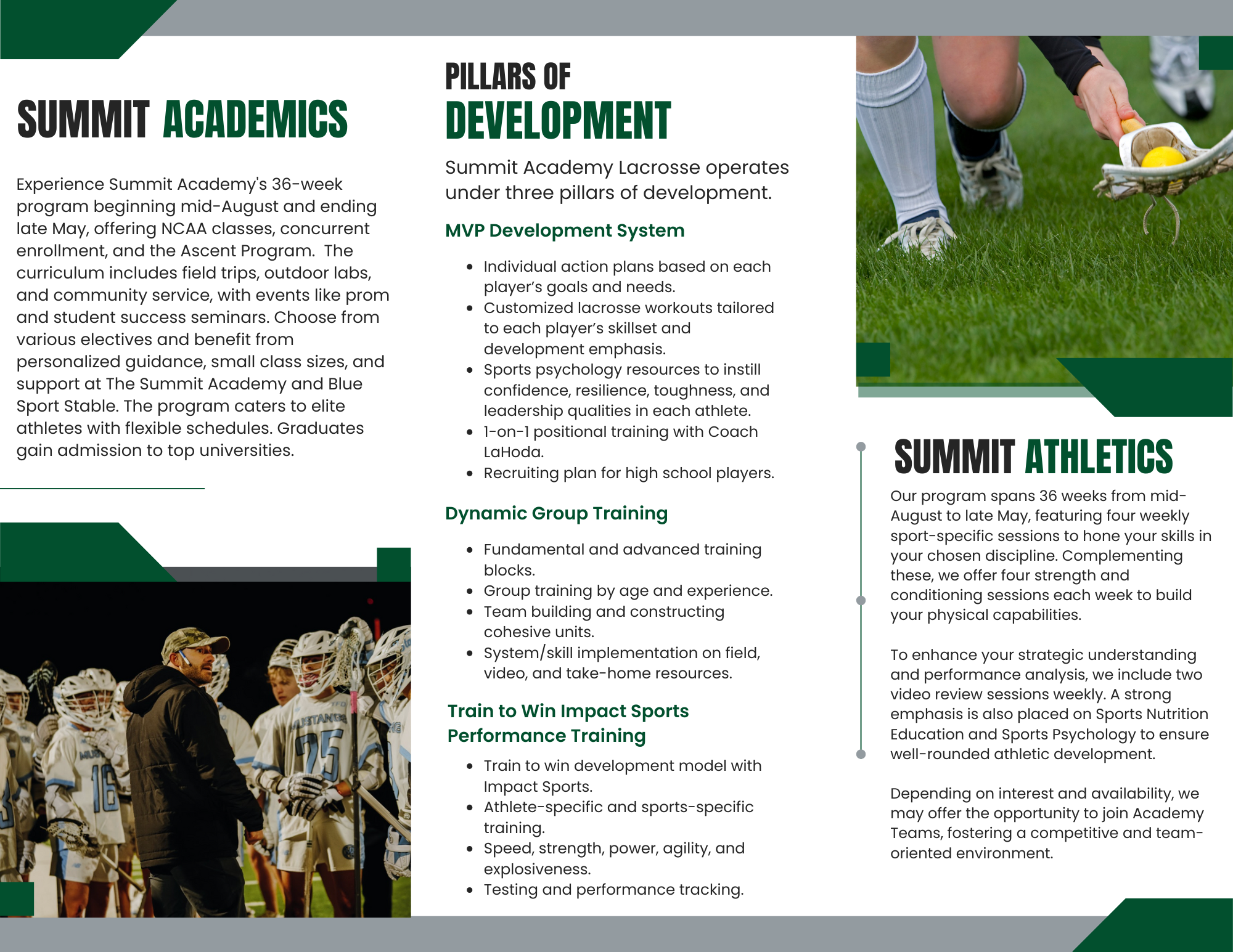 The Summit Academy Lacrosse program uses innovative and dynamic lacrosse training and a proven age-specific curriculum to give players an intentional and effective environment to develop in. The Lacrosse Academy is centralized around personal and player development, with an emphasis on helping players grow on and off the field. The program will be an intentional, challenging, and supportive ecosystem of lacrosse players who are looking to find their edge and take their game to new heights. Led directly by Ethan LaHoda and other highly qualified guest coaches, players will have access to an on-field experience unique to any lacrosse program in the state. The lacrosse program is designed to best serve 6th-12th grade players looking to advance their game and propel them to the next levels of lacrosse and life.